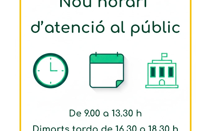 Horari d’atenció al públic de dilluns a divendres de 9 a 13:30 hores, dimarts tarda de 16:30 a 18:30 hores