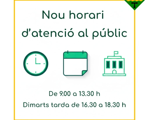 Horari d’atenció al públic de dilluns a divendres de 9 a 13:30 hores, dimarts tarda de 16:30 a 18:30 hores